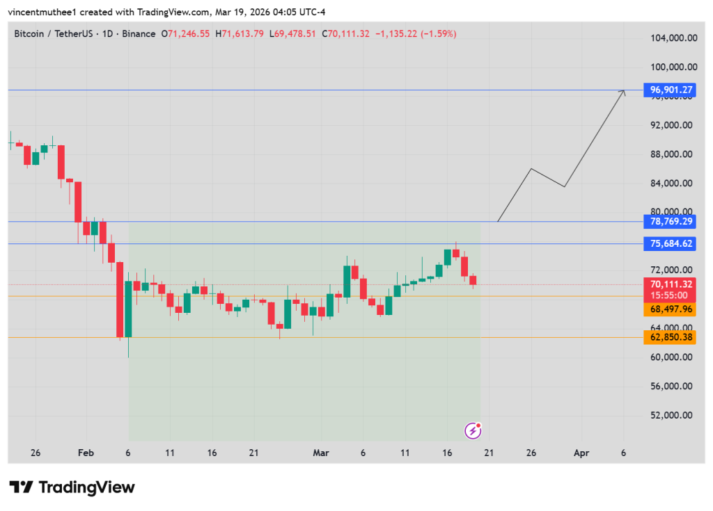 Bitcoin traded at $70,111 on March 19, after a 4.9% dip on the day (Image: TradingView)