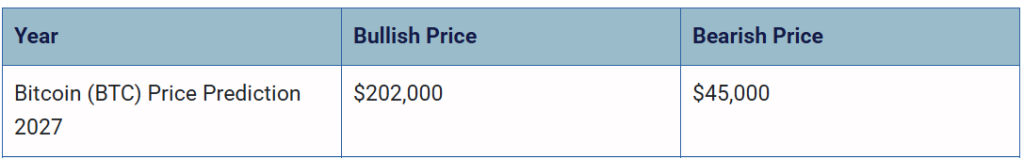 A recent Bitcoin price prediction highlights that Bitcoin could reach as high as $202,000 by the end of 2027, if adoption grows significantly and the macro scene remains favorable. However, a drop to $45,000 may occur by then if bearish pressure persists.