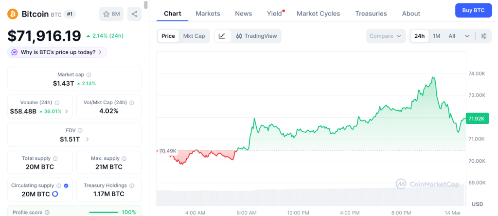 Bitcoin’s rally from $66,000 to $71,916 mirrors the early stages of every bull run recovery according to CoinMarketCap. ETF inflows at $568 million, institutional accumulation on chain, and clearing $74,500 resistance opens a direct path to $80,000 this week.