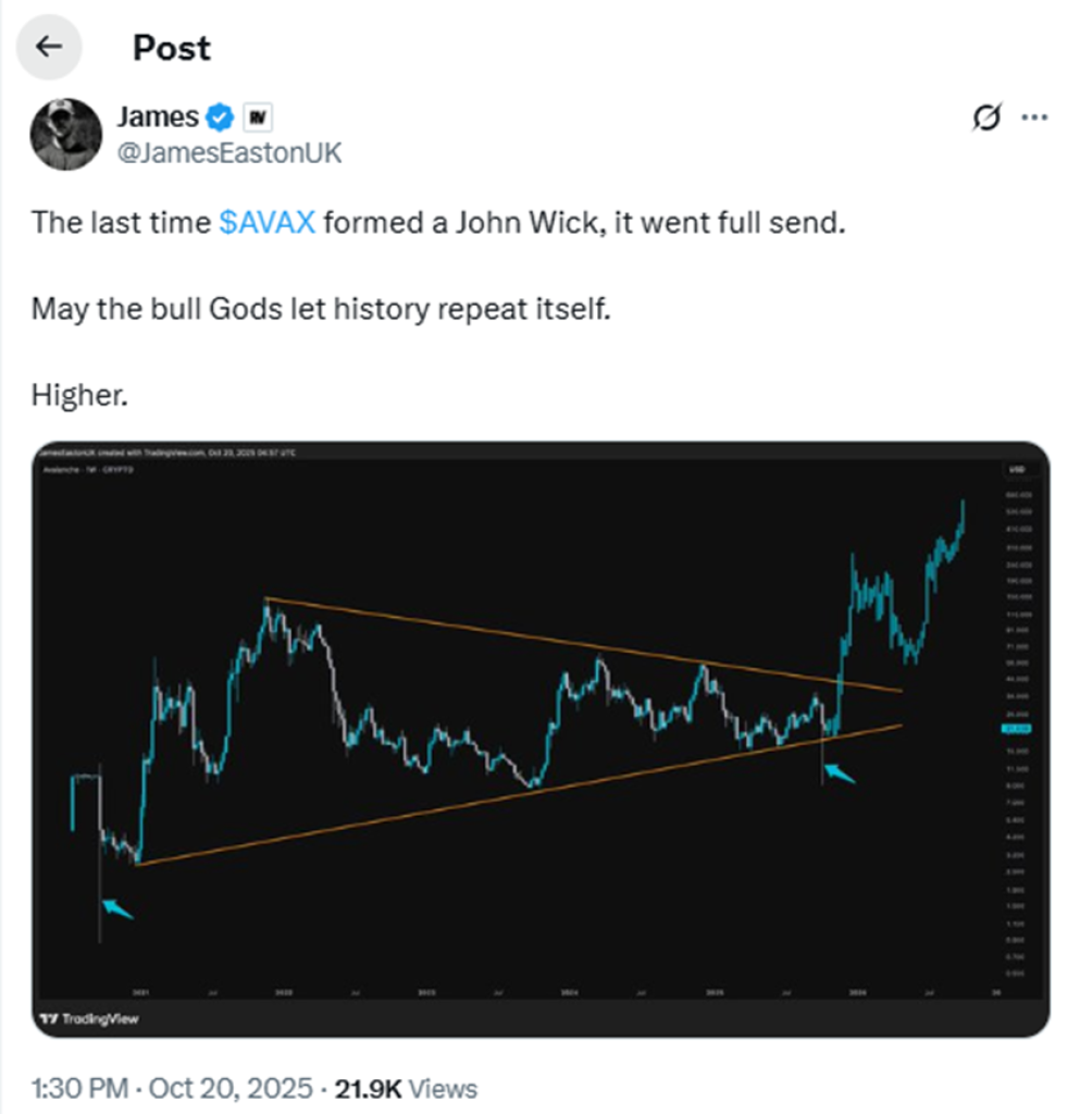 James highlighted a “John Wick” fractal similar to 2021’s pattern, predicting AVAX could reach between $45–$55 if momentum confirms above diagonal resistance.