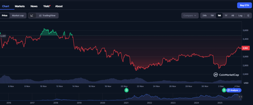 Ethereum has been showing some volatility in the past few weeks. CoinMarketCap shows that the ETH price increased from around $3,000 to nearly $3,200 on the one-week chart. But it also shows that the Ethereum value dipped nearly 10% in the past 30 days.