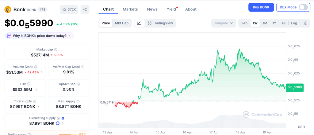 Bonk (BONK) trades near $0.0000059 with a $527 million market cap after dropping 83% from its $0.00005916 all-time high, according to CoinMarketCap. Changelly forecasts a 2026 high near $0.0000154, roughly 1.5x from current levels, tied to Solana ecosystem growth and continued DeFi integrations.