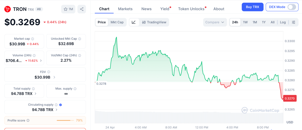 TRX currently trades near $0.32 per CoinMarketCap, ranked 8th globally with a market cap above $31 billion. The token reached an all-time high of $0.4313 and sits 24% below that peak, with $0.295 support holding the base.