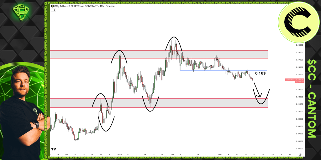 Looking at the 12-hour chart shared by Sjuul, the picture is hard to ignore. The CC price has been in a steady downtrend since late last year, making lower highs and lower lows with almost textbook precision. Every time it tries to bounce, sellers step in and push it back down.
