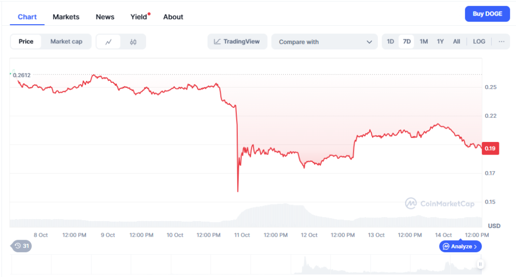 Dogecoin price has begun to move upwards after hitting the support of $0.18. However, according to CoinMarketCap data, the DOGE price remains down by 19% on the 7D chart.