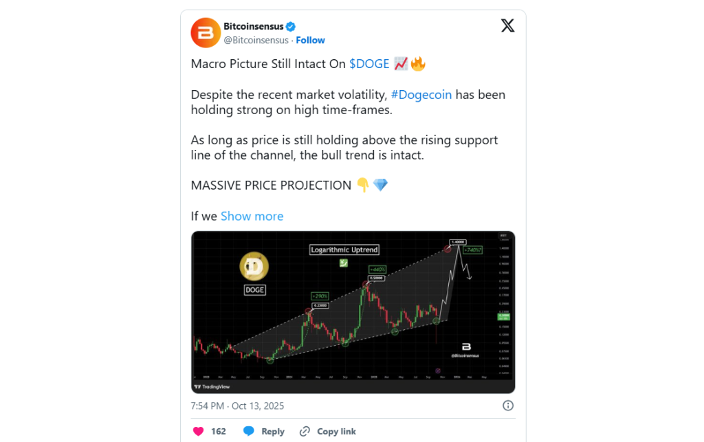 <blockquote class=”twitter-tweet”><p lang=”en” dir=”ltr”>Macro Picture Still Intact On <a href=”https://twitter.com/search?q=%24DOGE&src=ctag&ref_src=twsrc%5Etfw”>$DOGE</a> 📈🔥<br><br>Despite the recent market volatility, <a href=”https://twitter.com/hashtag/Dogecoin?src=hash&ref_src=twsrc%5Etfw”>#Dogecoin</a> has been holding strong on high time-frames.<br><br>As long as price is still holding above the rising support line of the channel, the bull trend is intact.<br><br>MASSIVE PRICE PROJECTION 👇💎<br><br>If we… <a href=”https://t.co/tf9XWWEpe7″>pic.twitter.com/tf9XWWEpe7</a></p>— Bitcoinsensus (@Bitcoinsensus) <a href=”https://twitter.com/Bitcoinsensus/status/1977810298506453453?ref_src=twsrc%5Etfw”>October 13, 2025</a></blockquote> <script async src=”https://platform.twitter.com/widgets.js” charset=”utf-8″></script>