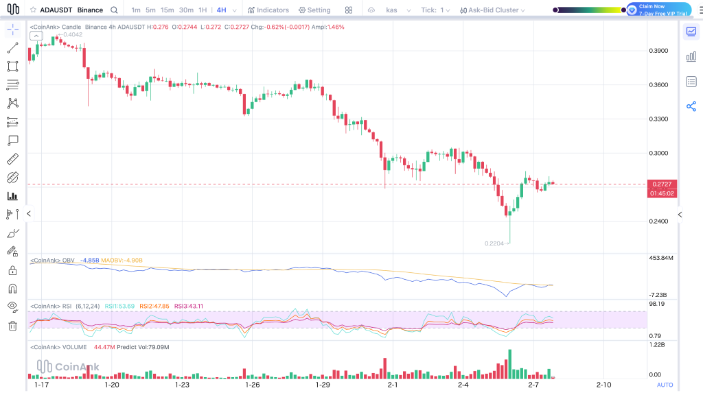 As can be seen from the 4-hour chart, the trend is clear: ADA has been dropping over time, with its recoveries failing to reach old highs. It’s been one of those slow bleed selloffs that keeps wearing traders down.
