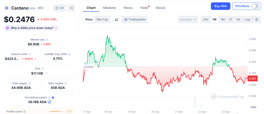 Cardano (ADA) trades at $0.24 on April 23 per CoinMarketCap, holding support above $0.236 after the golden cross. Resistance sits at $0.264, and a push above $0.30 would signal the first real trend change since the drawdown began.