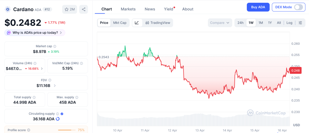 ADA sits at $0.248 as of April 15, down 92% from its $3.10 all time high reached in September 2021 according to CoinMarketCap. Changelly projects an April range of $0.236 to $0.248 and a possible push to $0.303 by June if momentum returns.