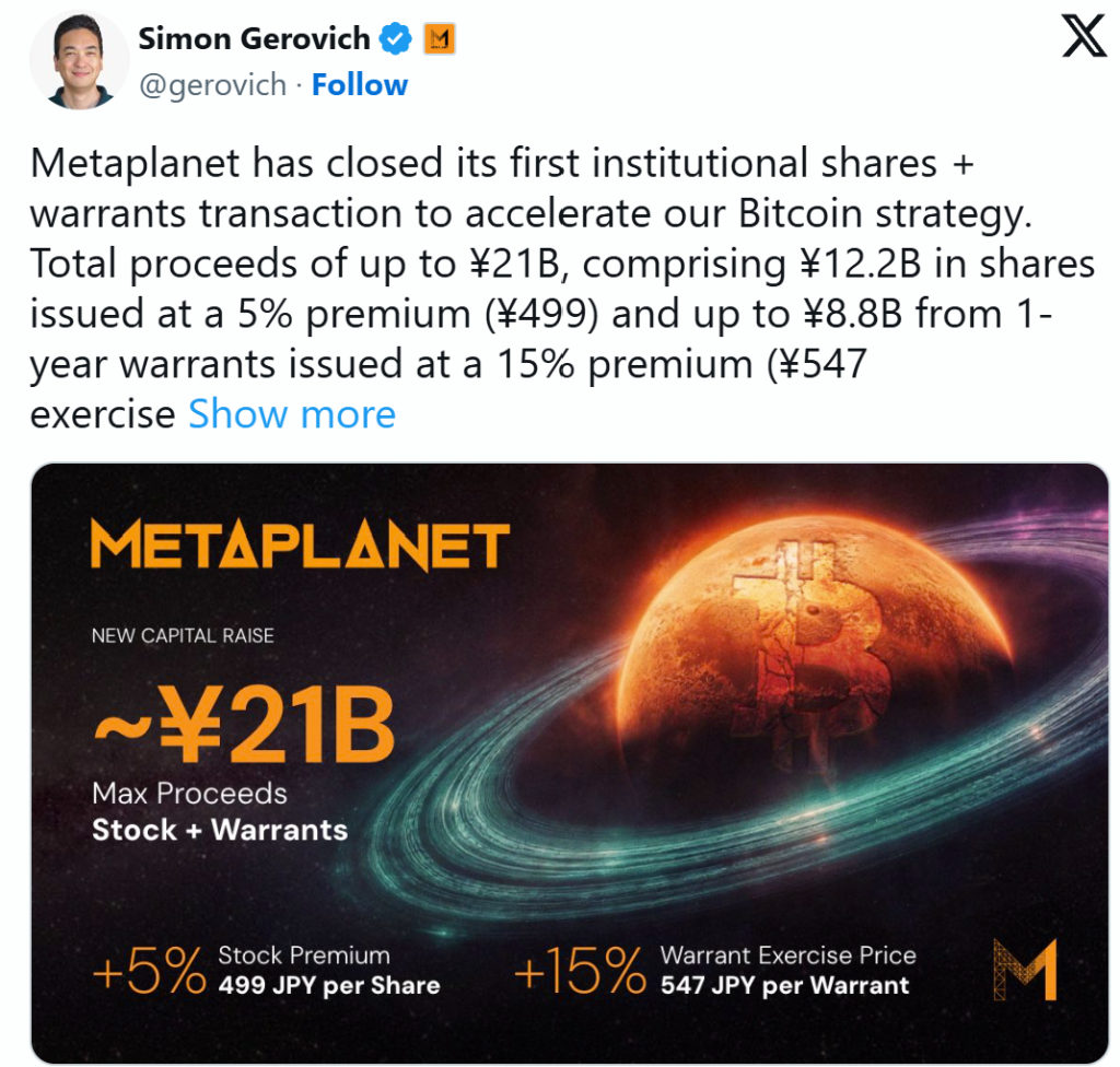 Metaplanet plans $137 million capital raise for Bitcoin acquisitions