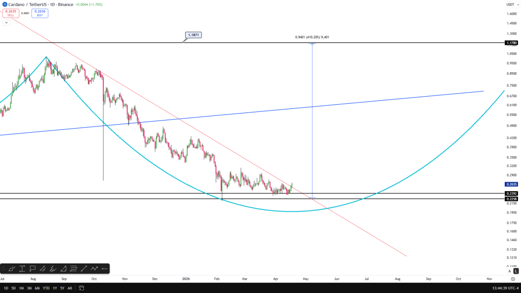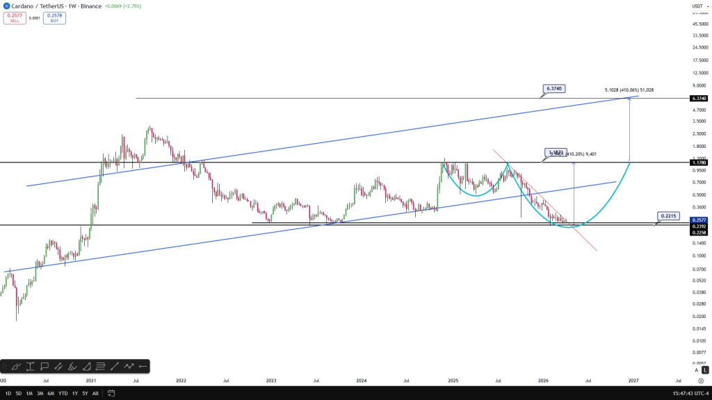 Cardano (ADA) trades at $0.26 today, up modestly on the daily chart. That is a far cry from its all‑time high of $3.10. Most investors have written off ADA as a laggard that may never recover. But one analyst disagrees. He shared two charts – a daily and a weekly – and called the mid‑ to long‑term structure “absolutely perfect.” His bull run target for ADA is $6.30. A break occurred on the daily chart, he says. Patience will be rewarded.