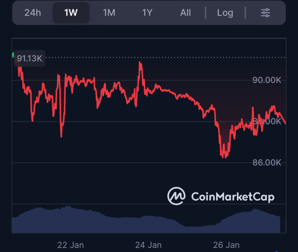 Bitcoin’s price weakened notably this past week, dipping from around $91,130 on January 21 to roughly $87,876 by January 27, reflecting a 4% weekly decline. Unfortunately, traders who had hoped for consolidation near the $90,000 mark saw their hopes dashed.