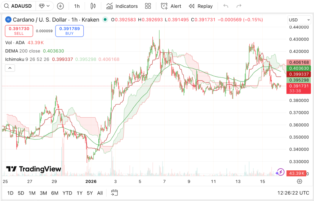 ADA’s price change at the moment of writing is -3.39% and, and ADA is trading at $0.3918. The market capitalization of Cardano is $14.09 billion, while its trading volume has fallen back to $579.55 million – down over 20% in the last 24 hours. These numbers indicate that short-term activity is cooling, while long-term holders remain attentive to network fundamentals.