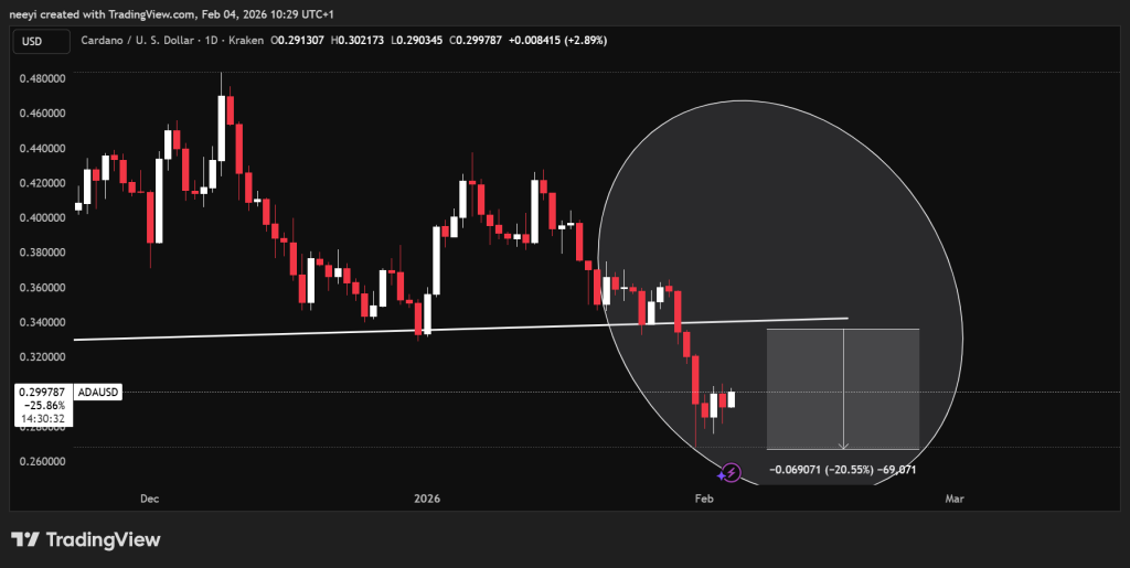 The decline that followed was sharp. Cardano price fell close to 20%. The move dragged ADA from around $0.33 down to $0.23. Some recovery followed, price now trades closer to $0.3 as ADA price enters a retest phase.