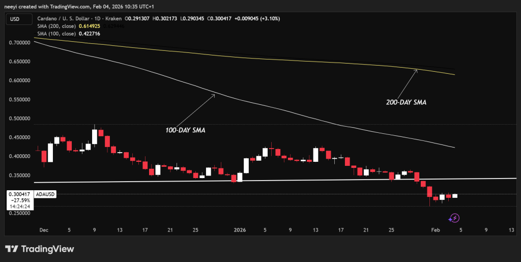 The 100-day and 200-day simple moving averages sit well above current Cardano price. Both levels act as overhead resistance. Distance from these averages leaves room for a wider rebound if conditions improve.