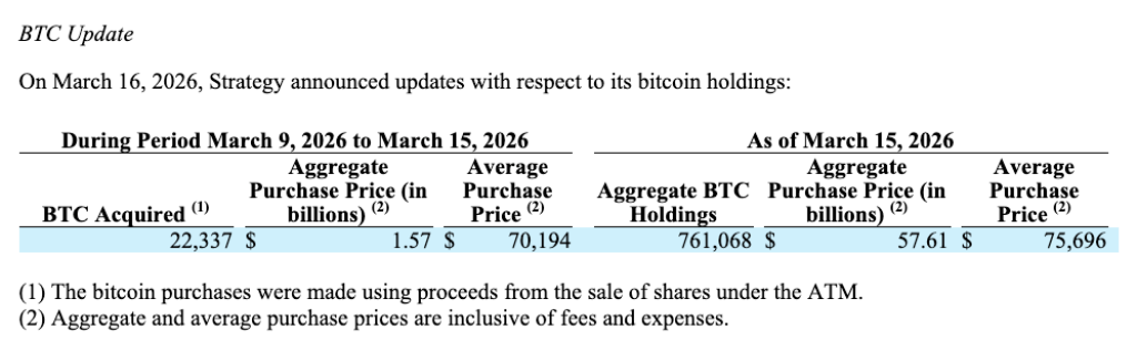 Strategy, the publicly listed largest corporate BTC holder, purchased 22,337 BTC valued at $1.57 billion last week. This recent acquisition, which occurred around the same time Bitcoin surged in price, has increased the firm’s total BTC holdings to 761,068.