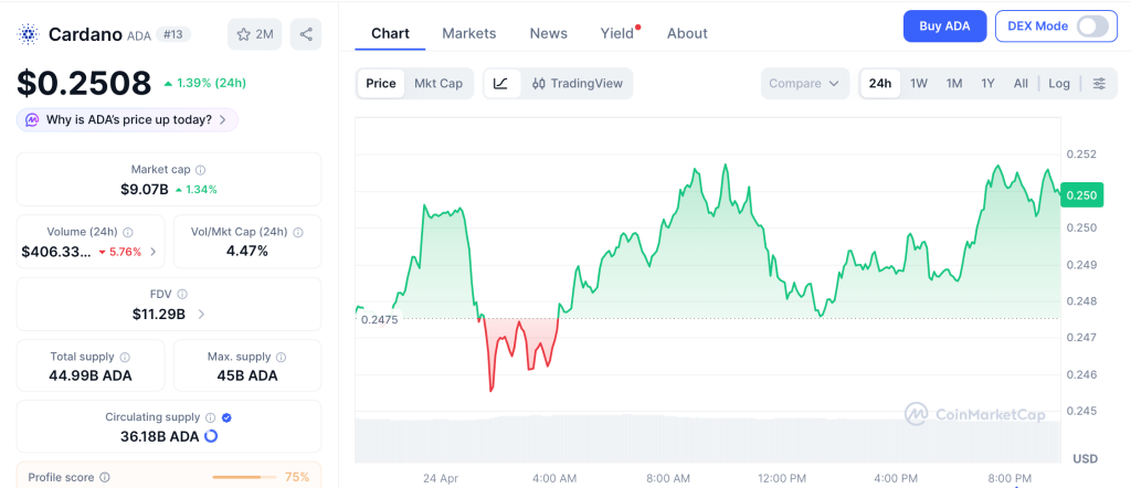 Cardano (ADA) trades at $0.25 today, down 3% in 24 hours, sitting 92% below the $3.10 all-time high from September 2021. The same capital rotating into Cardano is also flowing into Pepeto, the Ethereum based presale that crossed $9.45 million with a Binance listing approaching.