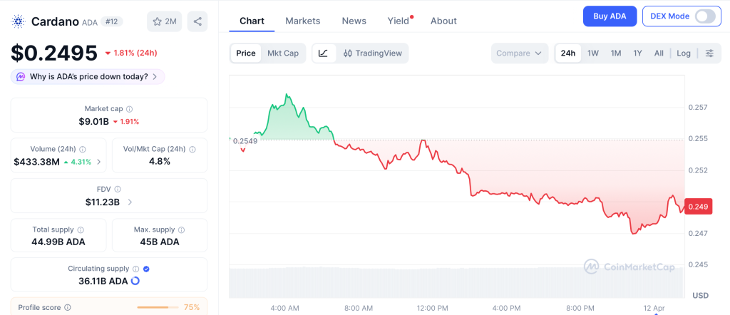 Cardano (ADA) trades at $0.249 according to CoinMarketCap, with a TD Sequential buy signal appearing on the weekly chart that has historically led one to four week expansions.