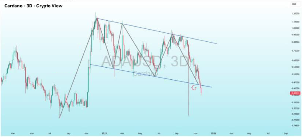 ADA needs to reclaim the $0.50 level to confirm bullish momentum and avoid further downside. Many traders expect a rebound toward $0.75 as the chart touches a multi-year uptrend support again.