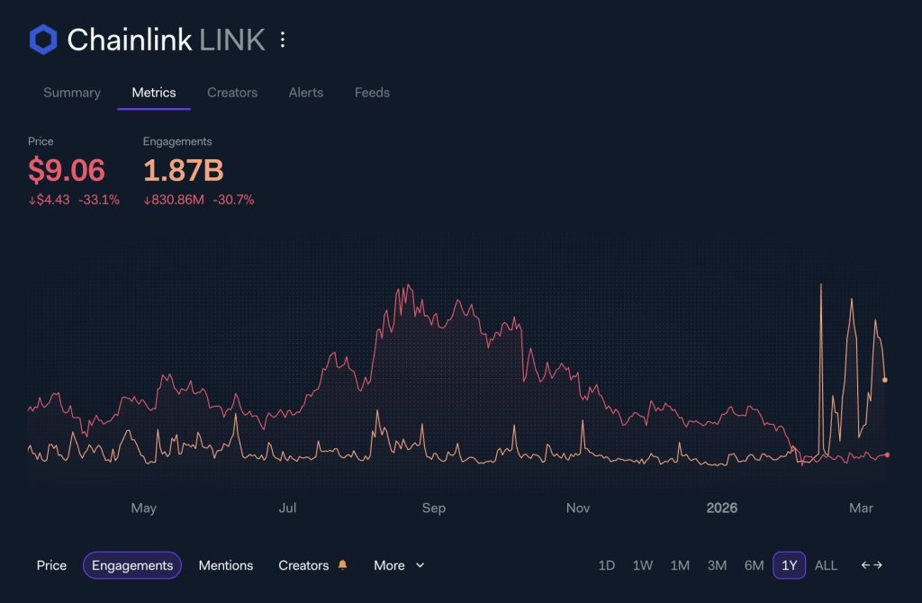The LINK price sits at $9.06 at the time of writing, but the numbers beneath the surface tell a much more interesting story. While the LINK price has pulled back from recent highs, social engagement around Chainlink has gone parabolic.