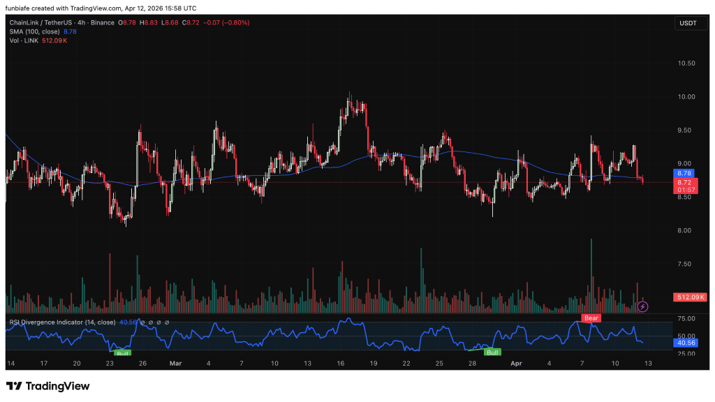 We had a look at the LINK chart, and the picture is tight. The LINK price is trading at $8.72, down 0.80% on the session, with a high of $8.83 and a low of $8.68. The 100 period SMA sits exactly at $8.78, right above current price.