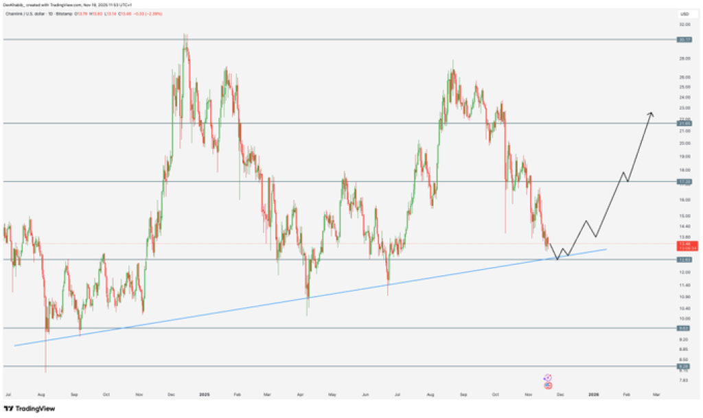 Zooming out, the chart shows a steady run of lower highs pushing LINK down toward support. But the bigger picture is more encouraging.