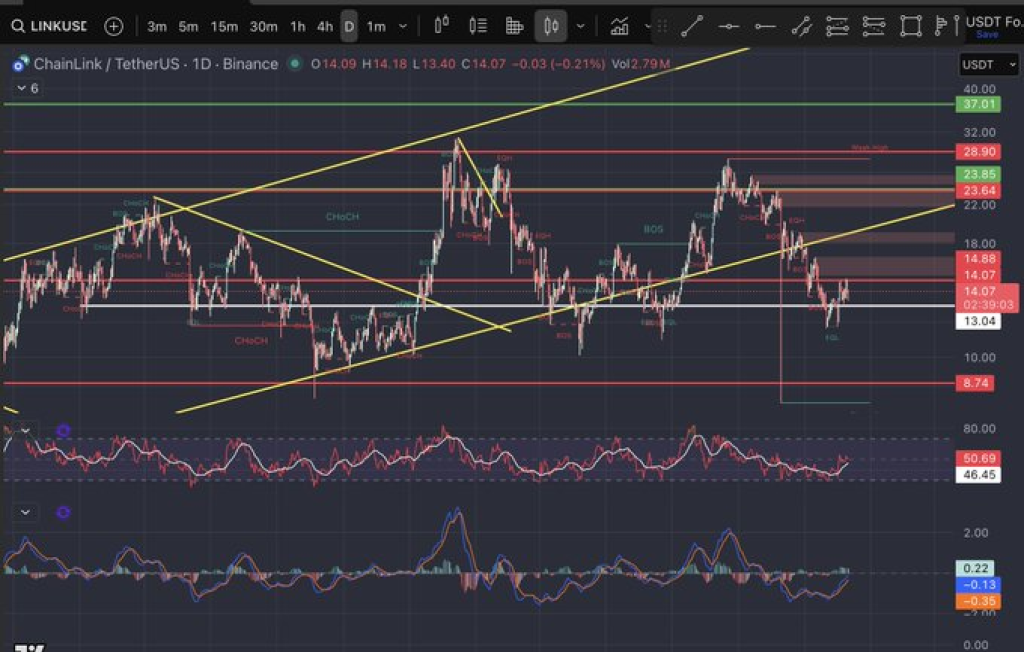 Cihan Türkmen points out that the $13 to $14 area has acted as a battleground several times. The chart reflects this perfectly. Each time LINK slides into this zone, price reactions become slower, candles tighten, and buyers attempt to reclaim control. Current market behavior mirrors those earlier phases, suggesting that Chainlink is searching for balance again.