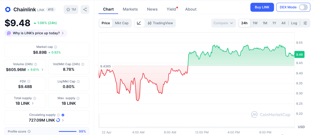 Chainlink (LINK) trades near $9.48 on April 22 with a market cap close to $6.84 billion, up 2.23% in 24 hours, and still 82% below its $52.76 all time high from May 2021 per CoinMarketCap.