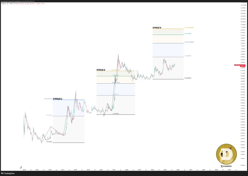 Now, Cycle 3 appears to be forming in a similar way. The projection suggests that if history repeats, Dogecoin price could climb from its current $0.25 range toward $2.28, the next 1.618 Fibonacci target. That would represent an 800% increase from here — or roughly a 10x spike.