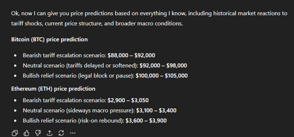 If tariffs are confirmed and risk assets sell off, ChatGPT projects Bitcoin trading in a $88,000–$92,000 range over the following weeks, with Ethereum lagging near $2,900–$3,100.
