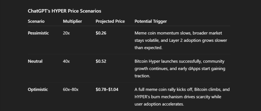 If Bitcoin Hyper continues to gain traction, ChatGPT’s predictive reasoning offers three potential paths based on different market conditions.