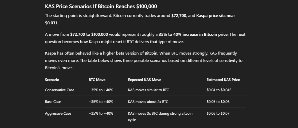 The current reference point is simple. Bitcoin sits near $72,700 and Kaspa trades near $0.031. A move from $72,700 to $100,000 would mean BTC rises about 35% to 40%.