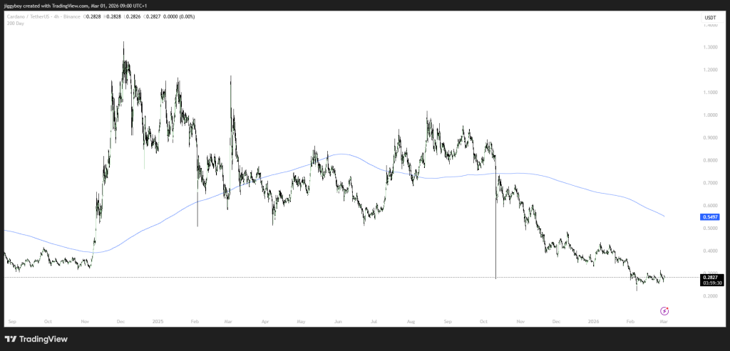 Cardano is trading near $0.2831 after a long stretch of falling prices.For a while now, every time ADA tries to bounce, it runs out of energy fast.