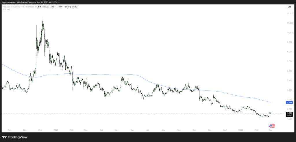 Polkadot is currently trading near $1.61, also deep below its 200-day moving average, which sits far higher around the $2.70 region and continues to slope downward.