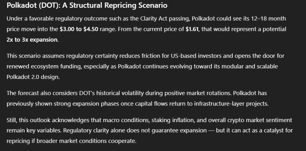 If the CLARITY Act brings regulatory clarity and sparks renewed institutional confidence, Polkadot could reasonably target the $2.20 to $3.00 range within 3–6 months.