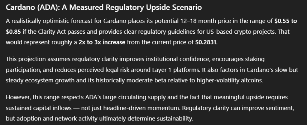 If the CLARITY Act passes and regulatory clarity improves sentiment, a realistic recovery scenario places the Cardano price in the $0.40 to $0.55 range over the next 3–6 months.