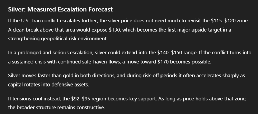 If the U.S.-Iran conflict escalate further, the silver price does not need much to revisit $115–$120. A clean break above that zone would expose the $130 area, and in a prolonged geopolitical shock, silver could stretch toward $140–$150.