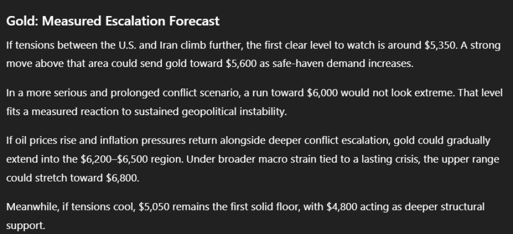 If tensions climb from here, the first clear level to watch is around $5,350. A strong move above that area could send gold toward $5,600 fairly quickly. In a more serious and drawn-out conflict, a run to $6,000 would not look extreme.