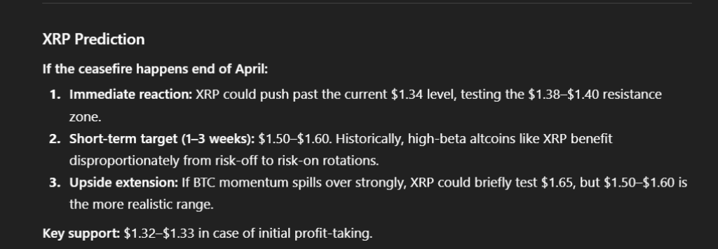 XRP is at $1.34. If the US and Iran strike a ceasefire by the end of April, it could jump to $1.38–$1.40 fast.