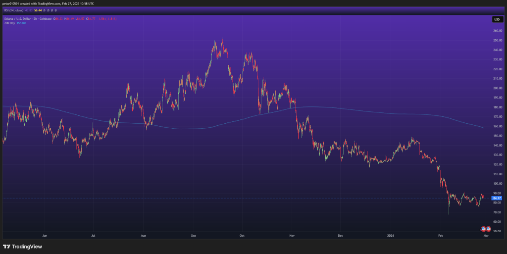Solana is currently trading around $85, after a prolonged decline from its late-2025 highs near $250. The 200-day moving average is far above price, near the $150–$160 region, showing the depth of the downtrend.