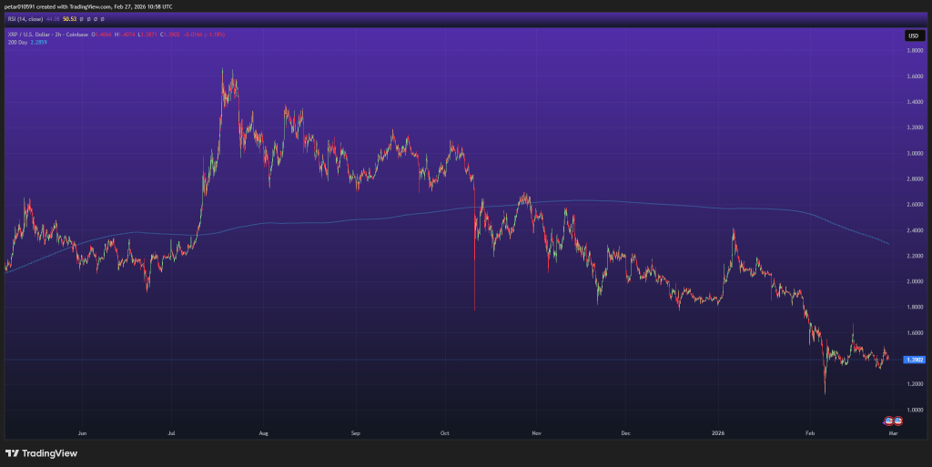 On the 2-hour chart, XRP is trading near $1.39–$1.40, well below its 200-day moving average, which sits above $2.20. The broader trend since late 2025 has been downward, with lower highs and lower lows. RSI is in the mid-range, not deeply oversold but not showing strong bullish momentum either.