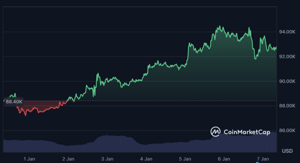 Bitcoin is starting the year with strength, but not without turbulence. After briefly dipping below $92,000 yesterday, the BTC price quickly reclaimed that level and turned it back into short-term support. The price is now trading around $92,700, recovering from a rejection near $94,500 earlier this week.