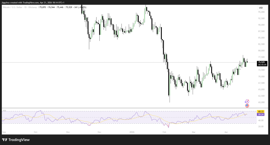 Every peak is lower compared to the previous one, while every trough is also declining. At present, the price action is hanging above the $75,000 support level.