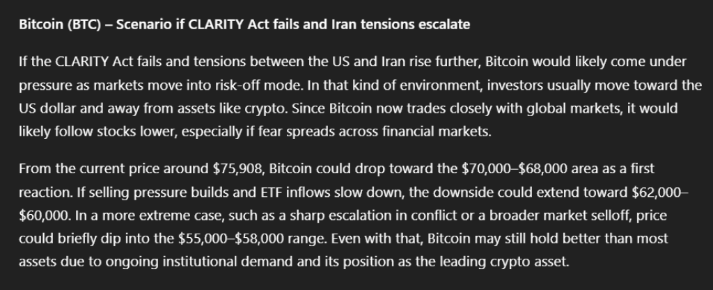 If the CLARITY Act fails and US–Iran tensions increase, Bitcoin comes under pressure as investors reduce exposure to risk assets. Capital typically moves toward the US dollar in this environment, and crypto follows global markets lower.