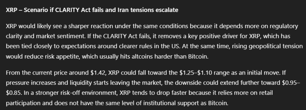 However, If the CLARITY Act fails and US–Iran tensions escalate, both Bitcoin and XRP face downside pressure.