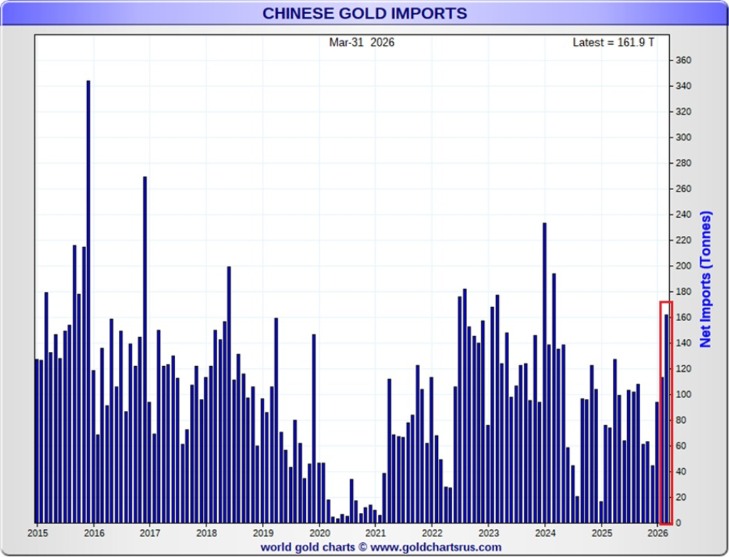 The attached chart (Chinese gold imports, blue bars) shows a clear uptrend starting in late 2025 and accelerating into 2026. The March bar is the tallest since the 2024 peak. China is not diversifying away from gold, but doubling down on it. The combination of central bank buying and retail import demand creates a powerful bid under the gold market.