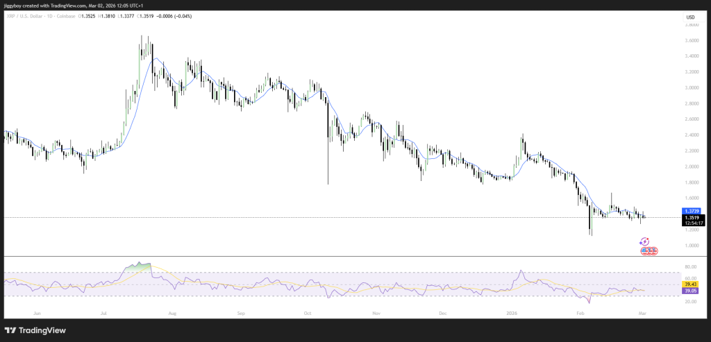 The 200-day moving average is around $2.20 to $2.30, and it’s still pointing lower. XRP is trading at $1.35, well under that line. So the bigger picture hasn’t turned yet.