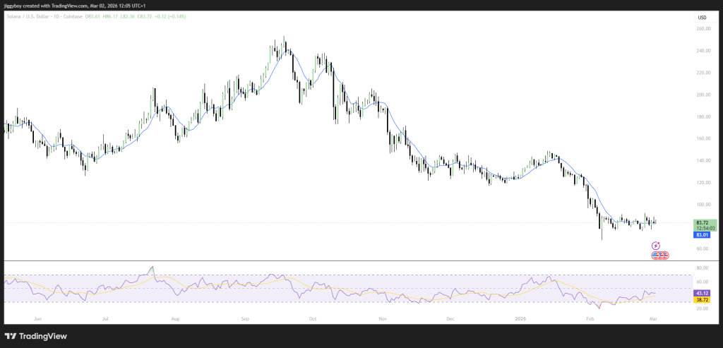 Price flushed into the high-$70s before stabilizing around the $83–$85 region. That zone is acting as short-term support. The SOL price is trading at $83.88.