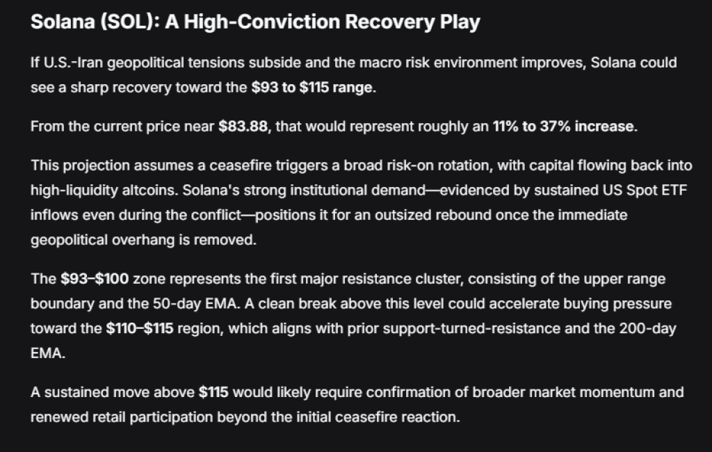 If U.S.–Iran tensions subside and macro risk appetite improves, DeepSeek AI projects Solana could recover toward the $93 to $115 range.