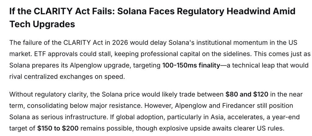 If the CLARITY Act is not passed, Solana might lose some of its institutional push. Approval for ETFs might take their time, and professional money might be benched. Solana is also preparing for the upcoming Alpenglow upgrade, targeting 100 to 150ms finality. This is a big technical improvement, on par with what traditional exchanges can do.